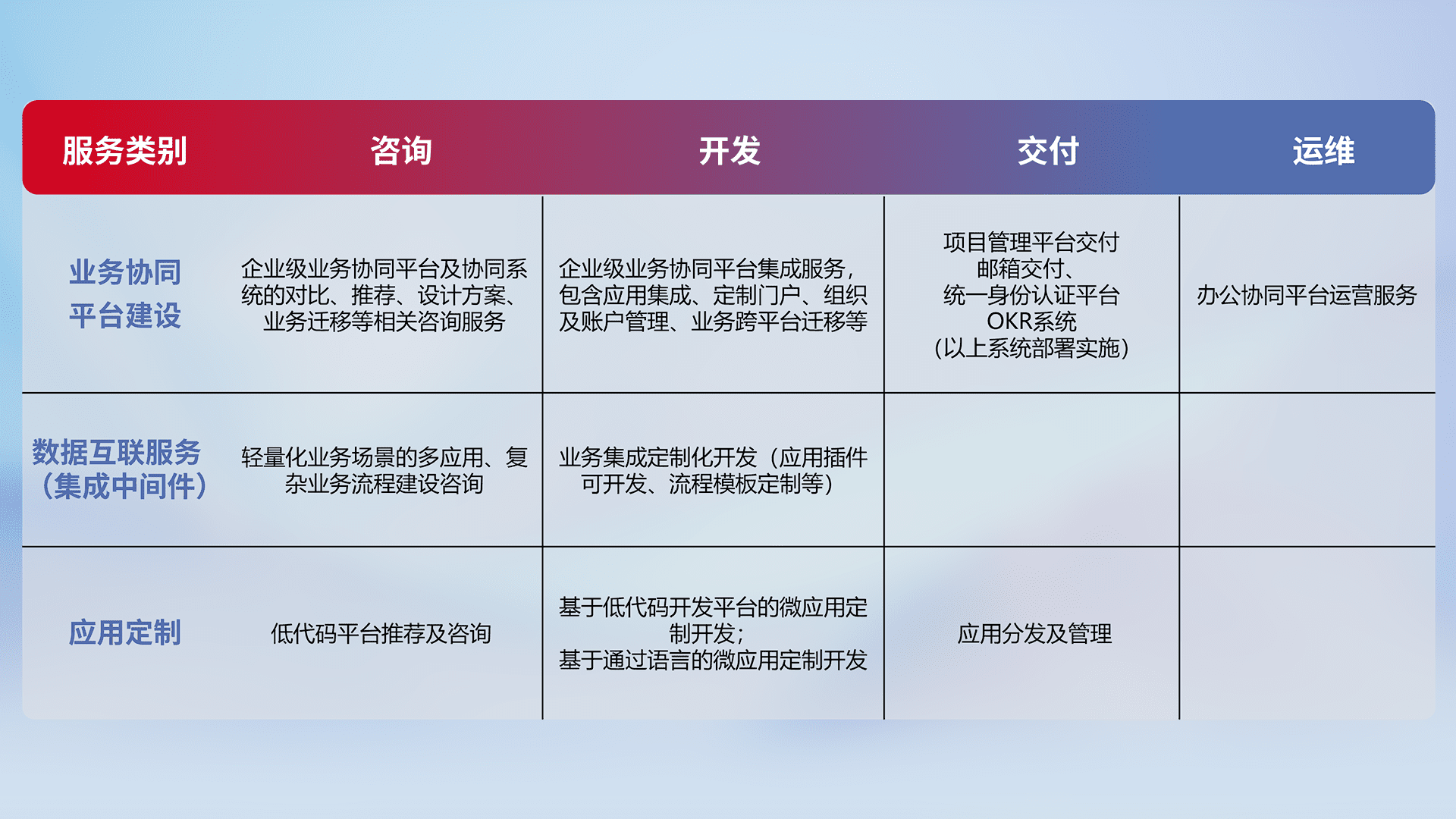 针对钉钉、、、企微、、IDaas等平台级产品提供产品的规划、、、方案、、交付、、、定制化开发等服务,,,实现如统一协同办公、、、、智能客户服务、、、、混合会议管理、、、智能数据查询、、等业务场景,,实现数字化转型。。