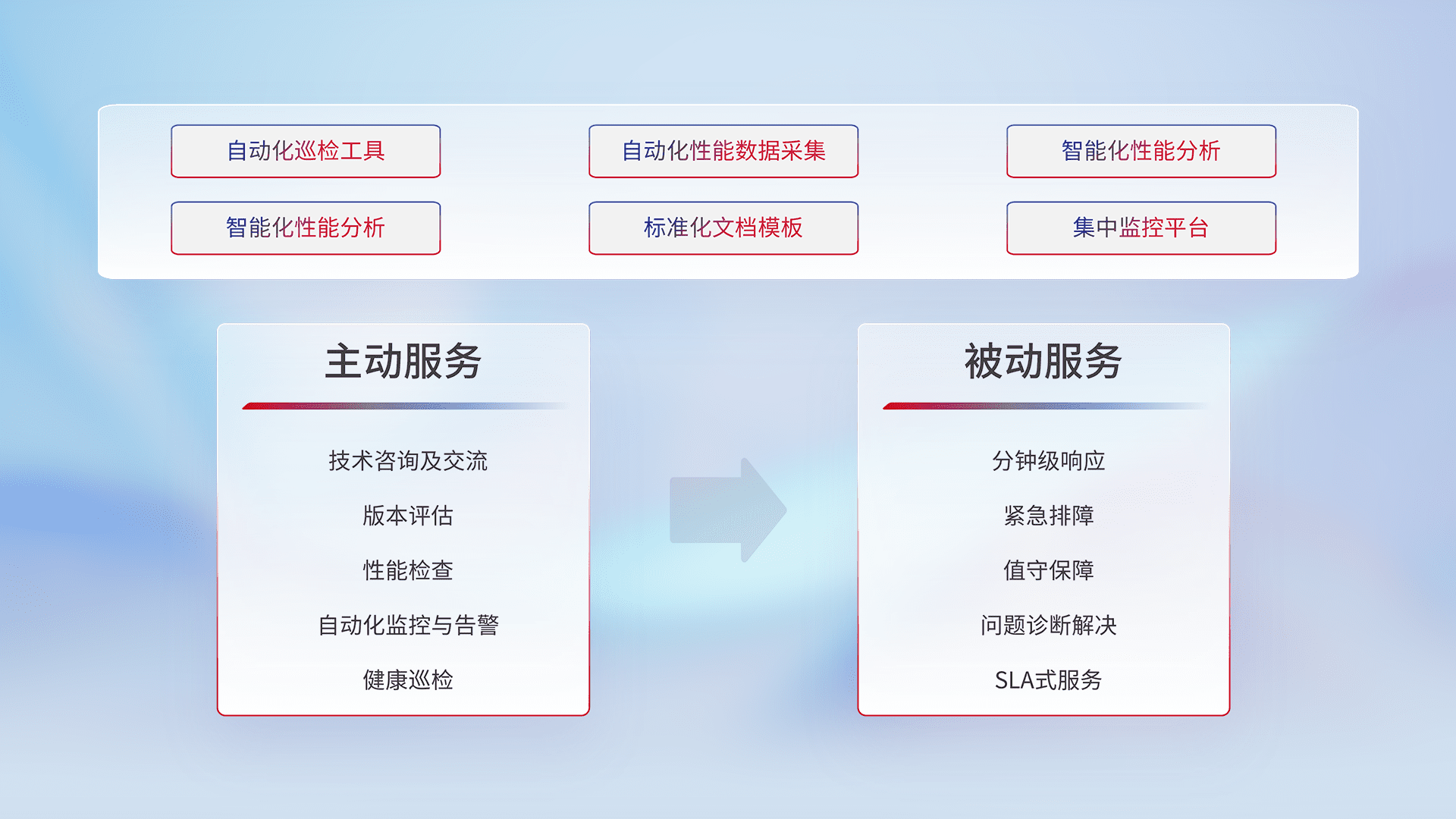 智能化工具和标准化文档,,,保障服务质量,,,,提供主动服务(包含技术咨询、、版本评估、、性能检查、、、、自动化监控与告警、、健康巡检)和被动服务包含(分钟级响应、、、紧急排障、、、值守保障、、、、问题诊断解决、、、SLA服务)。。。。